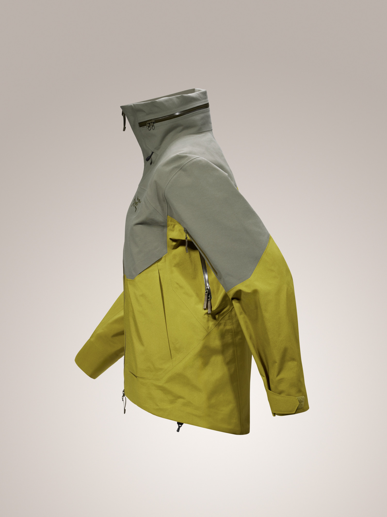 Waterproof, durable, wind-resistant GORE-TEX PRO ePE with a highly abrasion-resistant recycled nylon canvas face reinforces the collar, front and back yoke, and the top of the sleeves for added durability, free from intentionally added PFAS